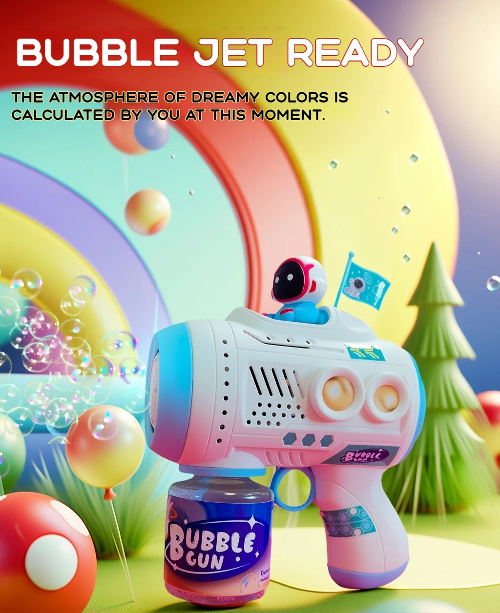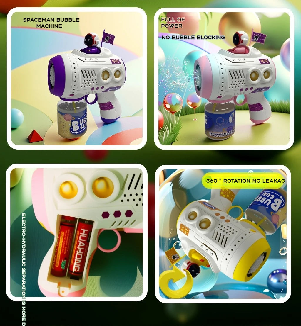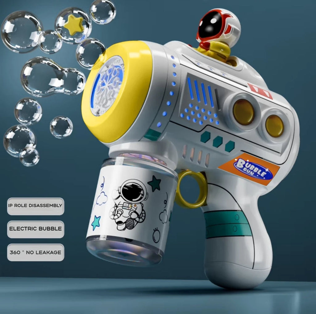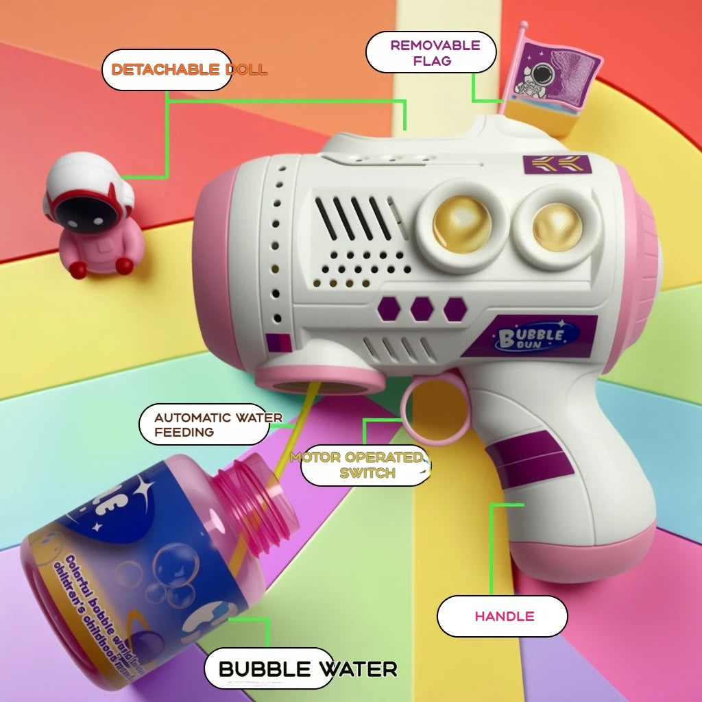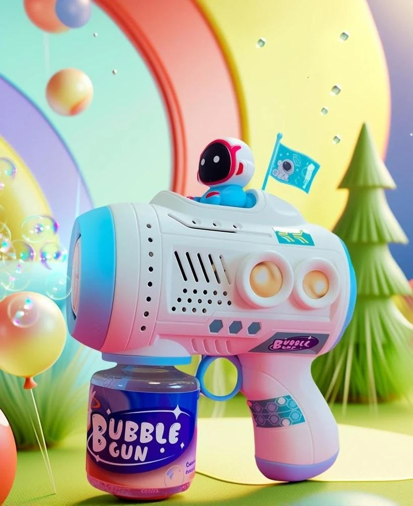 Pistola de bolhas elétrica que cria uma cascata mágica de bolhas com iluminação LED. Indicado para festas de aniversário, eventos ao ar livre e momentos especiais das crianças.